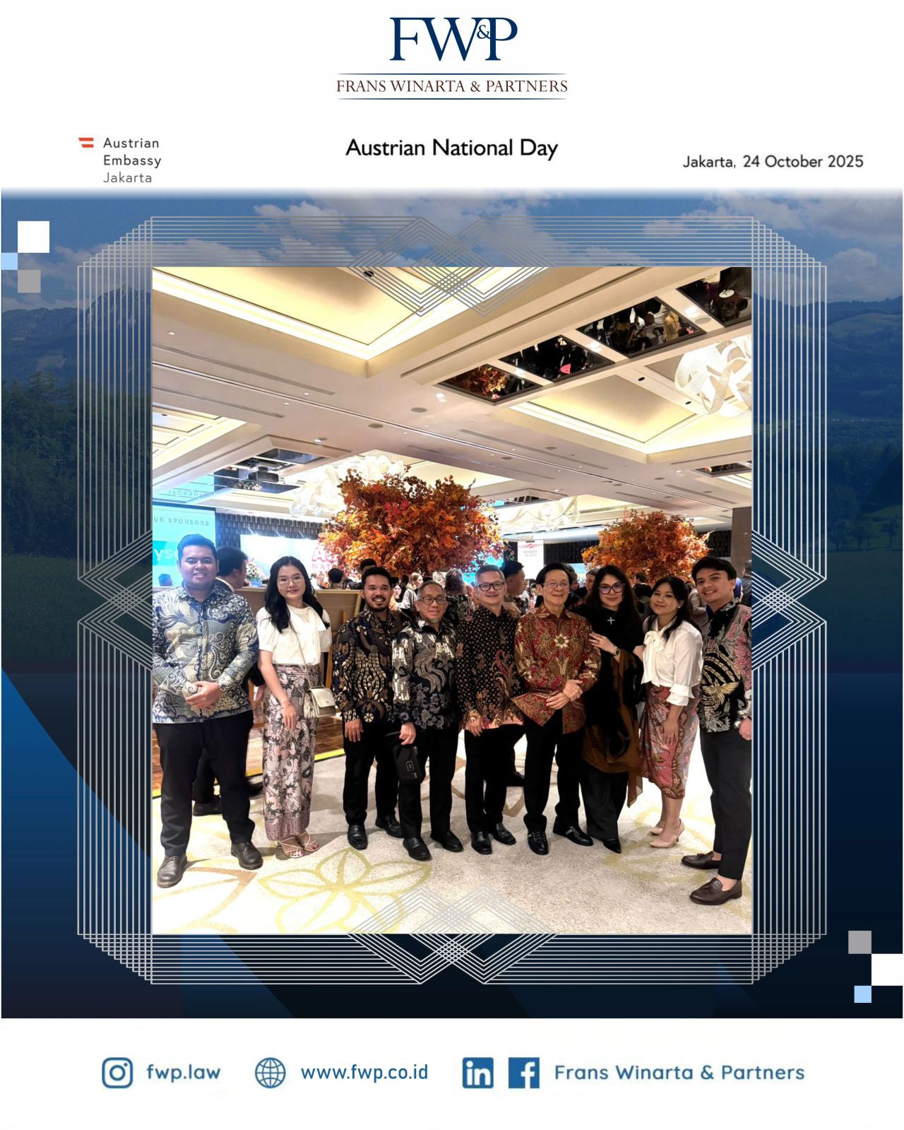On Friday, 24 October 2025, Our Managing Partner Mr. Frans H. Winarta, our Partners Ms. Patricia Ann Winarta and Mr. Randolph Jay Winarta, as well as our Senior Partner, Mr. Harri Budiman, along with the associates, attended the Austrian National Day Reception at Ayana Midplaza Hotel Jakarta.We are so grateful to have attended this event and given our support to the Embassy. ...